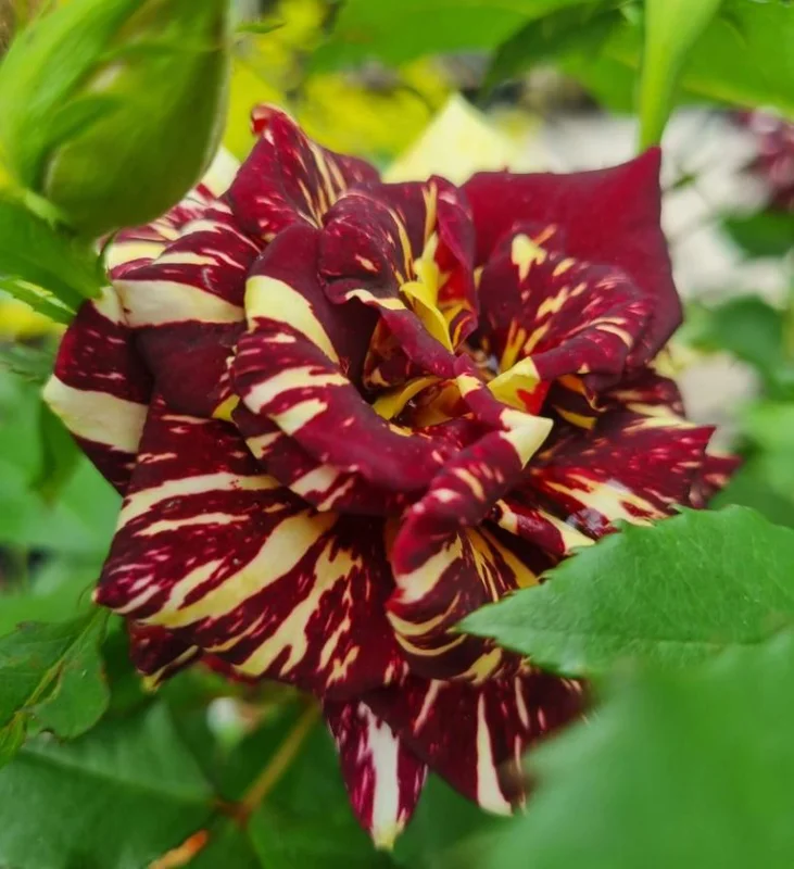 Introduce a spectacular focal point to your garden with the Abracadabra rose bush. This remarkable live floribunda plant is celebrated for its truly unique and captivating striped flowers, where no two blooms are ever identical. Each flower is a masterpiece, showcasing an exquisite blend of deep burgundy red and creamy yellow stripes, creating a dramatic and eye-catching display that makes it one of the most unique rose varieties available. As a floribunda rose, the Abracadabra provides a continuous burst of color from late spring through late autumn, making it a garden favorite. Its upright growth habit and classically shaped blooms on long stems also make it an excellent choice for cutting and bringing indoors to adorn your living space. This compact and bushy rose typically reaches a height of 2-3 feet, making it versatile for various garden settings.
