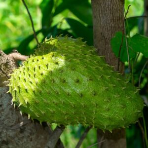 Soursop fruit is heart-shaped with a rough green skin and soft fleshy spines. Its fresh, juicy flesh has a unique flavor that is both creamy and slightly acidic. The fruit can be enjoyed fresh, pureed with vanilla ice cream, or dried into sweet fruit leather. Grafted varieties are particularly prized for their less acidic taste and smooth texture.