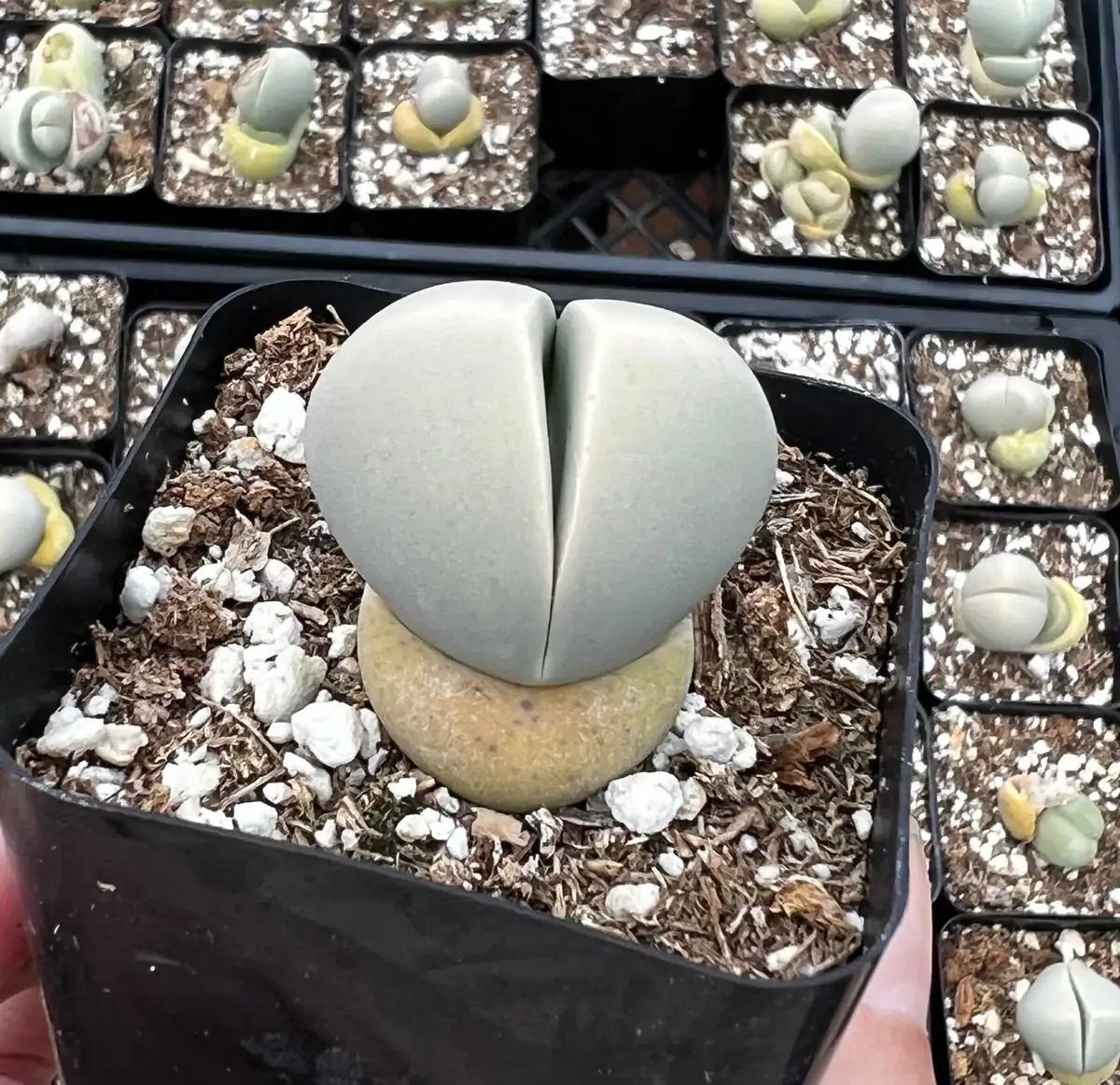 Sunlight requirements: This living stone succulent thrives in bright, direct sunlight. Place it in a south-facing window where it can receive at least 4-6 hours of direct sun daily. If direct sun is not possible, very bright indirect light supplemented with a grow light can also work. Insufficient light will cause the plant to etiolate (stretch) and lose its compact, desirable shape. During intense summer heat, some afternoon shade might be beneficial to prevent scorching, especially if transitioning it from a less sunny environment.