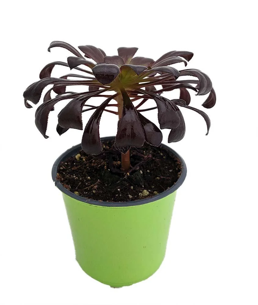 Introduce a touch of dramatic beauty to your collection with the black rose tree succulent, Aeonium arboreum ‘Zwartkop’. This easy-care live plant features striking dark chocolate and plum-colored foliage, making it a reliable and visually stunning addition to any indoor space or warm outdoor garden. Arrives in a 2 inch pot, ready to thrive.