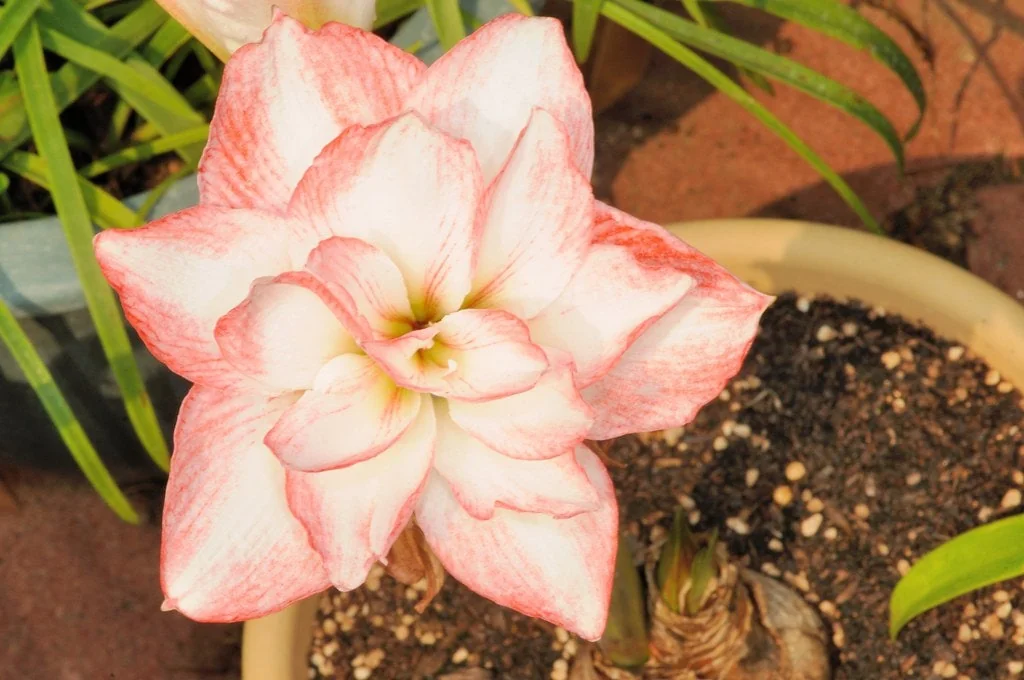 - Stunning Double Blooms: Enjoy large, fully double white flowers with captivating pink and red airbrushing, creating a dramatic and elegant display that stands out. This red and white amaryllis offers a truly unique color combination.