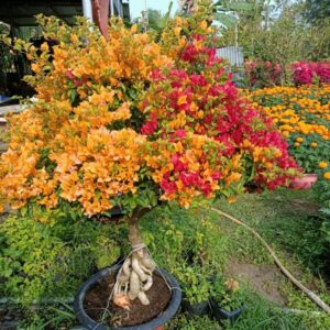 For optimal growth, water the Bougainvillea thoroughly until water runs out of the pot’s bottom. Allow the plant to experience a slight wilt before watering again, as this will encourage more abundant flowering. Ensure that the plant receives full sunlight for at least 6 hours a day to promote lush growth and vibrant colors.