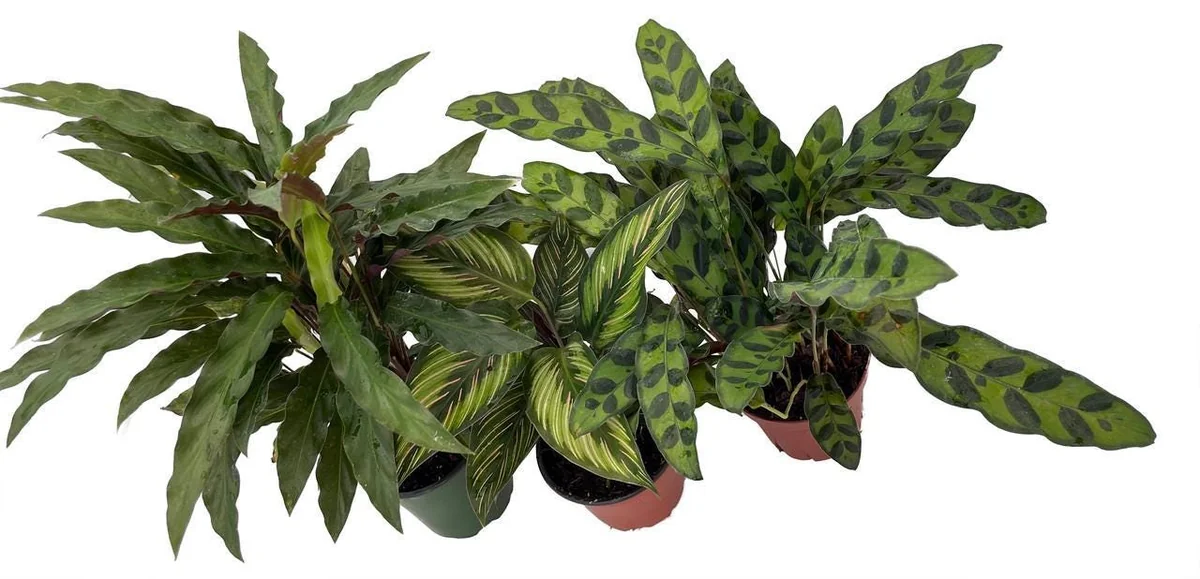 - Q: What size pot does it come in? A: Each of the three Calathea indoor plant specimens in this assortment comes in its own 4-inch diameter nursery pot, ready for display or repotting into a decorative container.