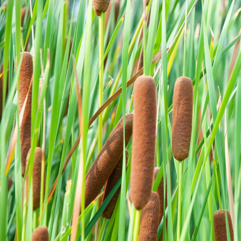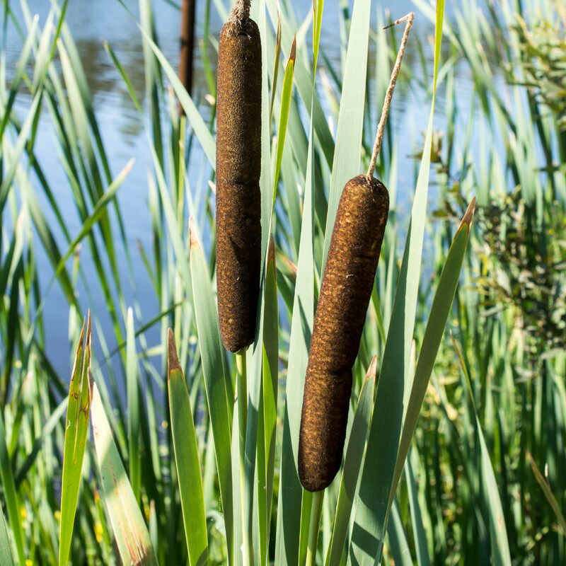 Cattails are upright perennial plants with distinctive brown, sausage-shaped “tails”. They thrive in boggy conditions or near ponds.