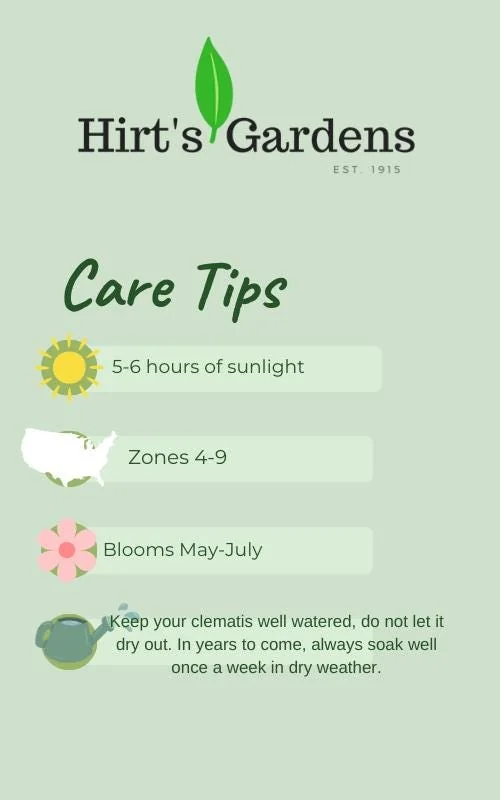 - Q: Will it survive winter in my zone? A: This perennial clematis is generally hardy in USDA Zones 4-9. In colder zones, it may require winter protection, while in warmer zones, ensuring adequate moisture is important. Proper clematis care helps it thrive.