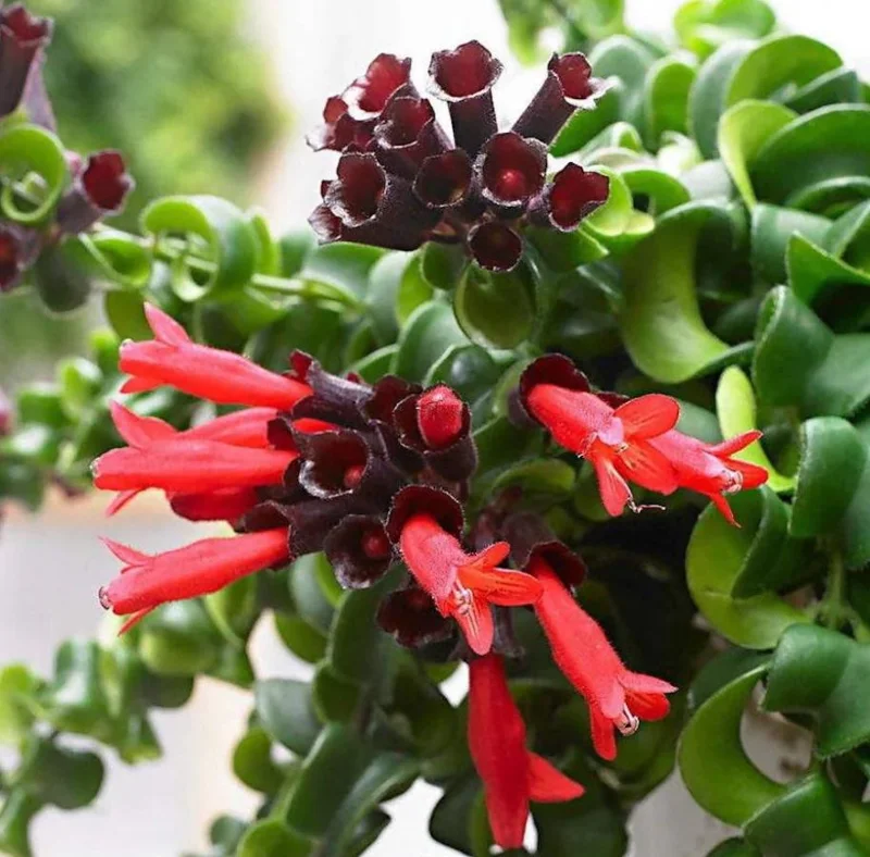 This offering includes a healthy curly lipstick vine plant starter, typically ranging from 5-8 inches in height. Please note that the plant will be shipped without a pot, carefully packaged to ensure its safe arrival. Upon receiving your plant, it is recommended to pot it in a suitable container with a well-draining potting mix. Aeschynanthus Radicans plants are known for their moderate growth rate and can develop long, trailing vines, often reaching lengths of 2-3 feet or more when mature. The distinctive curly leaves are typically 2-3 inches long, providing a unique texture to its foliage. With proper care, you can expect your plant to begin producing its vibrant lipstick plant flowers red within one to two growing seasons, creating a stunning visual display.