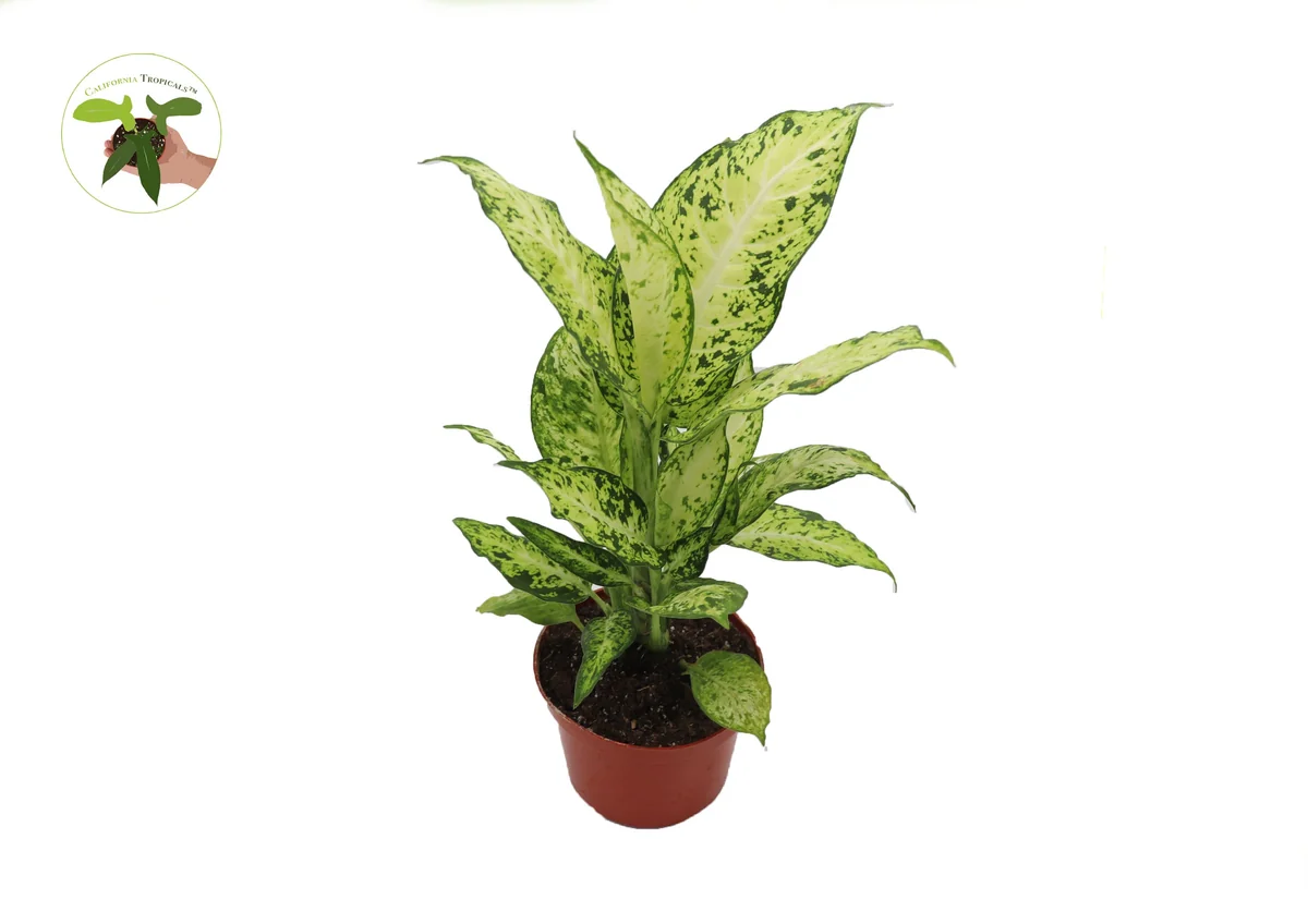 This offering is for a healthy dieffenbachia amy live plant, shipped in a 6-inch nursery pot. At this size, the plant typically stands approximately 10-14 inches tall from the base of the pot, with a spread of about 8-12 inches, showcasing its vibrant patterned foliage plant. The plant is well-rooted and established, ready to continue its growth in your home. Dieffenbachia Amy is a moderate grower, and with optimal conditions, it can eventually reach heights of 3-5 feet indoors, though its growth can be managed through pruning.