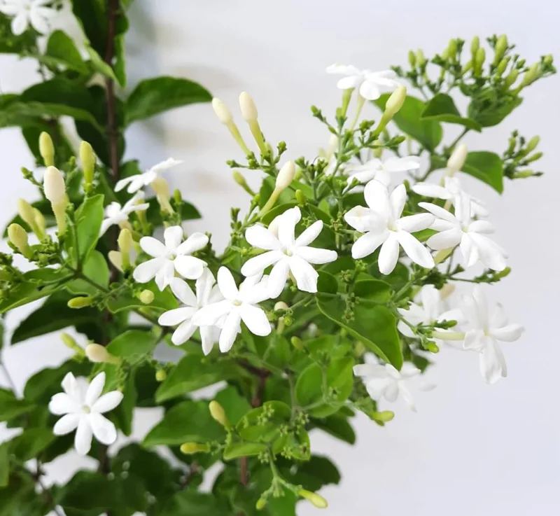 This white flowering jasmine is cold hardy in USDA Zone 9B. In areas prone to frost, some protection is preferred, such as covering the plant or planting it in a sheltered location. Fertilize your downy jasmine live plant with a balanced, slow-release fertilizer in early spring and again in mid-summer to support its continuous blooming. Pruning is essential to maintain its shape and size. It can be kept around 3 feet tall and 3 to 5 feet wide with regular trimming. It has a wide-branching growth habit, and consistent pruning will keep its height manageable and encourage a bushier form. Watch out for common pests like aphids or spider mites, and treat with organic insecticidal soap if necessary, as part of comprehensive downy jasmine care.
