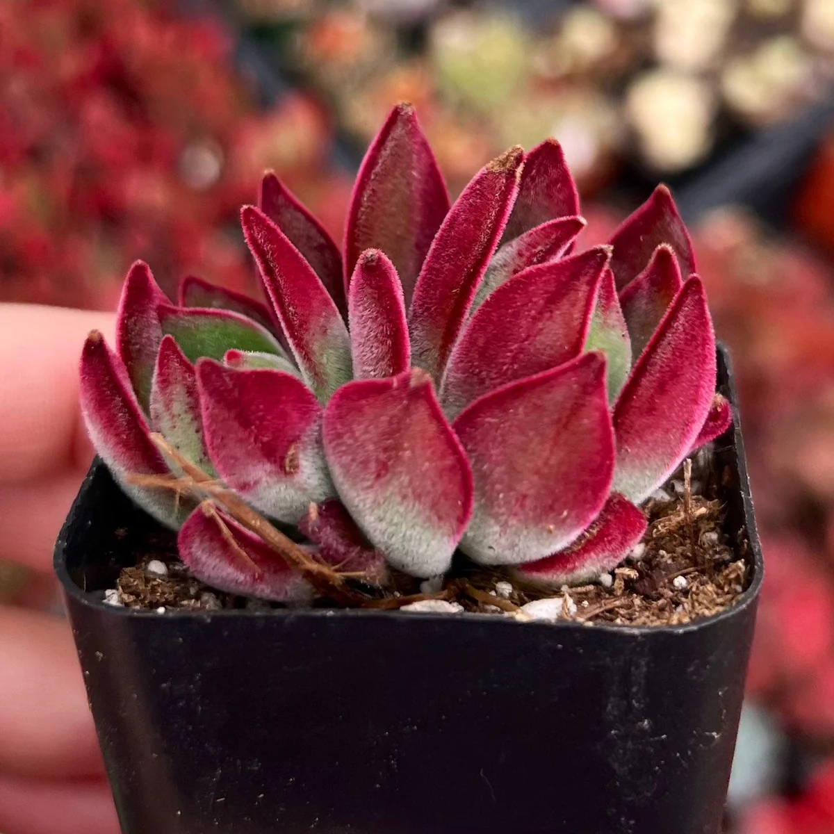 The Echeveria Harmsii Ruby Slippers is a truly captivating live succulent, celebrated for its unique beauty and ease of care. This particular variety, often referred to simply as Ruby Slippers succulent care, stands out with its rich, velvety red leaves that form a tight, elegant rosette. Its vibrant color and soft, fuzzy texture make it an eye-catching addition to any plant collection, whether you’re a seasoned succulent enthusiast or just beginning your green journey. As a live plant, it offers not just aesthetic appeal but also the joy of nurturing a living piece of nature. This compact succulent is perfect for windowsills, desks, or as part of a larger succulent arrangement, bringing a bold pop of color wherever it’s placed. Its striking appearance and manageable size make the Echeveria Harmsii Ruby Slippers a highly sought-after plant for modern interior decor.