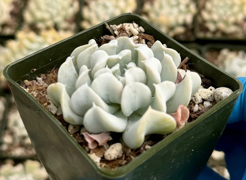 Common Problems and Solutions: Watch out for common succulent pests like mealybugs or aphids, which can be treated with insecticidal soap or neem oil. If leaves become soft or mushy, it’s likely due to overwatering; reduce watering and check for root rot. If the plant stretches, it’s seeking more light. The beautiful farina on the leaves is delicate, so try to avoid touching the leaves to preserve its protective coating and aesthetic.