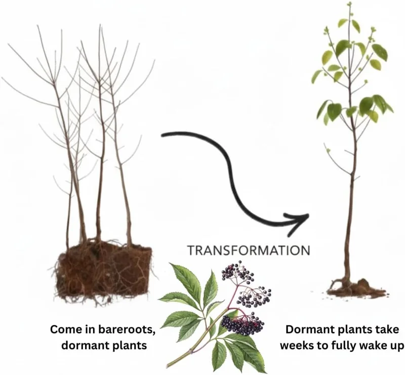 - Q: What condition will the plants arrive in? A: The elderberry rooted cuttings will arrive as dormant, bare root plants, typically 8-12 inches tall, with no leaves. This is normal and ensures they transplant well and establish strong roots.