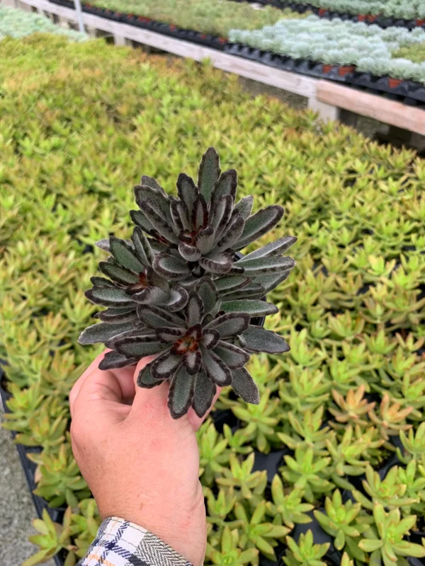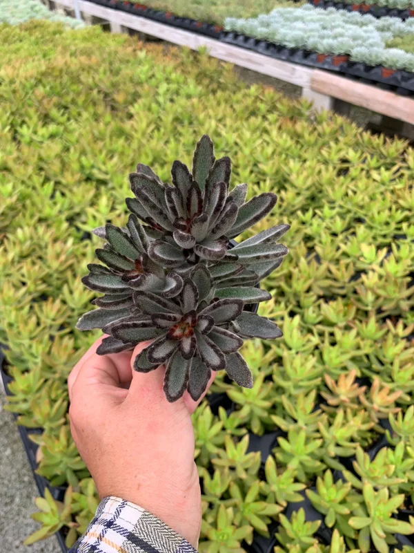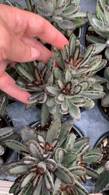 Q: What makes it a rare variegated succulent? A: The distinct brown edging on its fuzzy, blue-green leaves is a unique characteristic that sets it apart from more common succulents, making it a desirable and somewhat rare find for collectors.