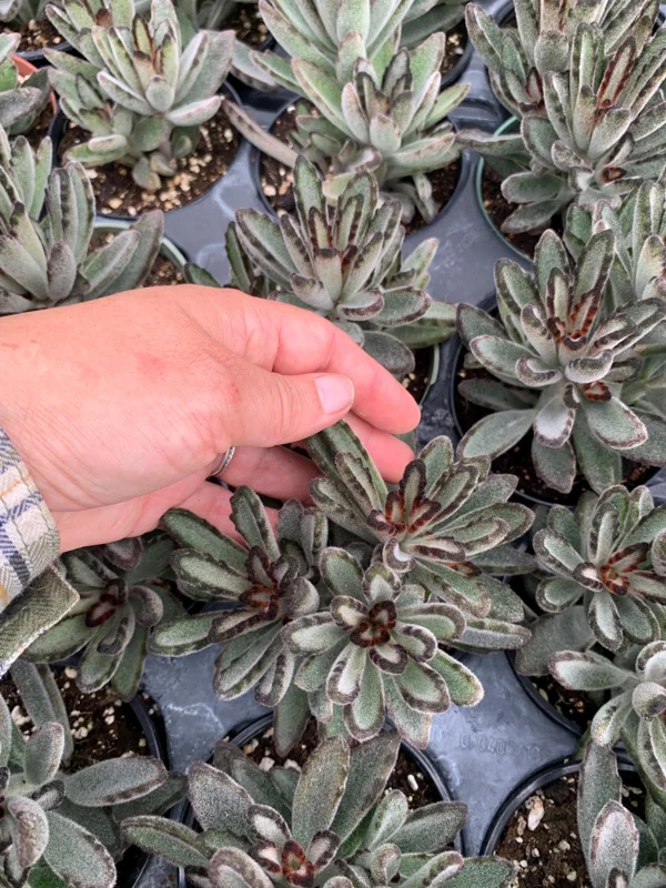 Unique Texture and Appearance: Its most notable feature is the velvety, fuzzy texture of its leaves, which provides a tactile and visual delight. The blue-green leaves with prominent brown edges create a striking contrast, ensuring it stands out in any plant arrangement.