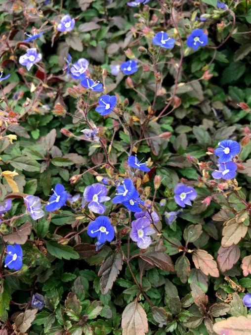 The Georgia Blue Veronica live plant is delivered in a 4 inch pot, providing a well-rooted and established specimen ready for immediate planting. This compact perennial typically reaches a mature height of 6-8 inches, forming a dense, spreading mat that can cover an area of 12-14 inches wide. Its low-growing habit makes it an excellent choice for front borders, rock gardens, or underplanting larger shrubs. The growth rate is moderate, allowing it to establish itself fairly quickly and begin to spread. You can expect the first flush of characteristic blue flowers from early spring to late spring, with the possibility of sporadic reblooming in favorable conditions. The evergreen foliage ensures consistent appeal throughout the year, with burgundy and copper tones intensifying in cooler weather. This blue flowering perennials is shipped as a healthy, actively growing plant, ensuring a strong start in your garden.