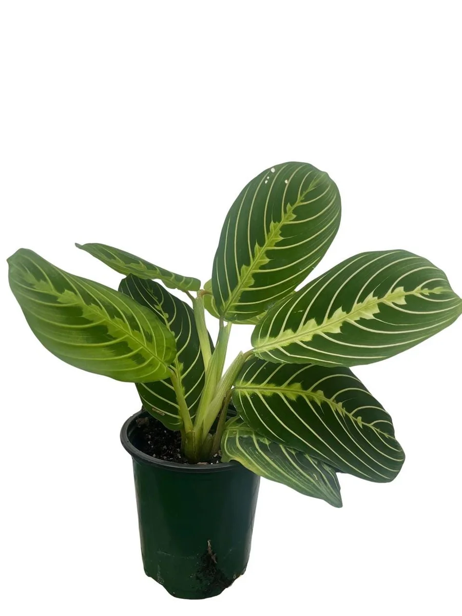 This golden lemon prayer plant is provided as a robust, live specimen, carefully cultivated to ensure a healthy start in your home. It comes pre-potted in a standard 4 inch pot, which is an ideal size for immediate display on shelves, desks, or windowsills. At the time of shipping, the plant typically stands approximately 6-8 inches tall from the base of the pot, with a spread of about 8-10 inches, though measurements are approximate and can vary slightly due to natural plant growth. This maranta live plant has a moderate growth rate and can eventually reach a mature height of 10-12 inches indoors, with its trailing or spreading foliage extending up to 12-18 inches wide. It is shipped in its nursery pot with well-established roots and healthy foliage, ready for you to enjoy. Expect the plant to continue growing and developing its vibrant coloration as it acclimates to its new environment and receives consistent prayer plant care.