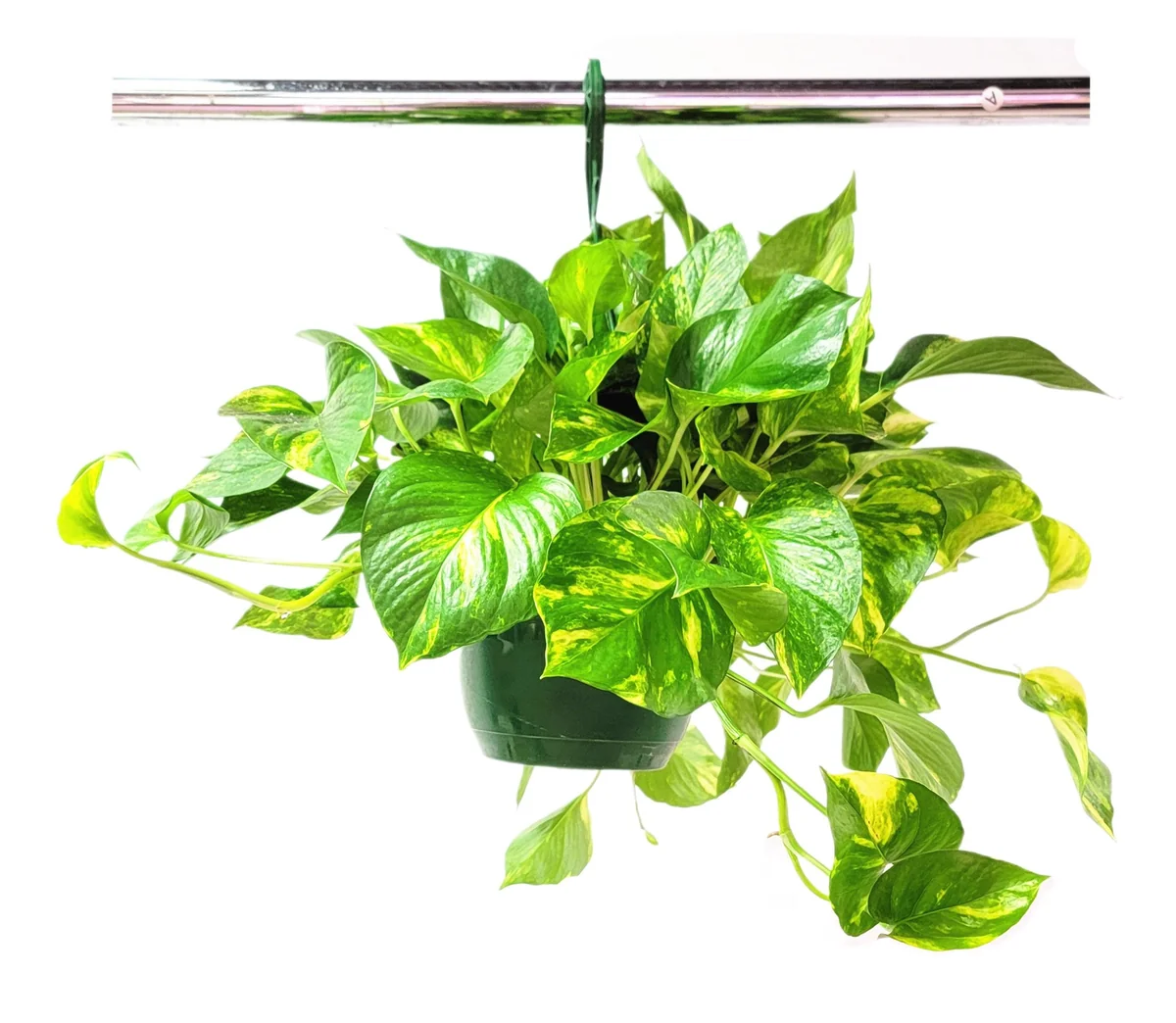 This offering includes one healthy golden pothos live plant, presented in a 10-inch nursery-style hanging basket. The plant arrives with established roots and lush, trailing vines, ready for immediate display. The exact length of the vines and the fullness of the plant may vary slightly due to its natural growth patterns, but each plant is selected for its vigor and beauty. The glossy, heart-shaped leaves display a beautiful mix of golden-yellow and deep green variegation, which can vary subtly from plant to plant based on genetics and light exposure. Hanging hardware is included, allowing you to easily suspend your new plant. Expect this fast-growing plant to produce vines that can extend several feet annually, adding significant cascading greenery to your space. This variegated pothos is perfect for creating a dramatic effect as it grows and trails.