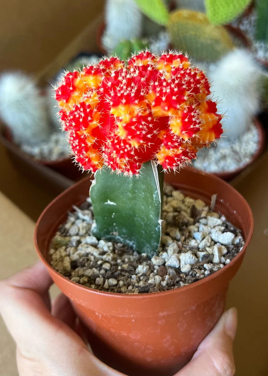 Q: What size pot does it come in? A: All these cacti, including the colorful moon cactus, the Cristata Brain Cactus, and the Rebutia Heliosa Cluster, come pre-potted in a 4-inch standard nursery pot, ready for immediate display or transplanting.