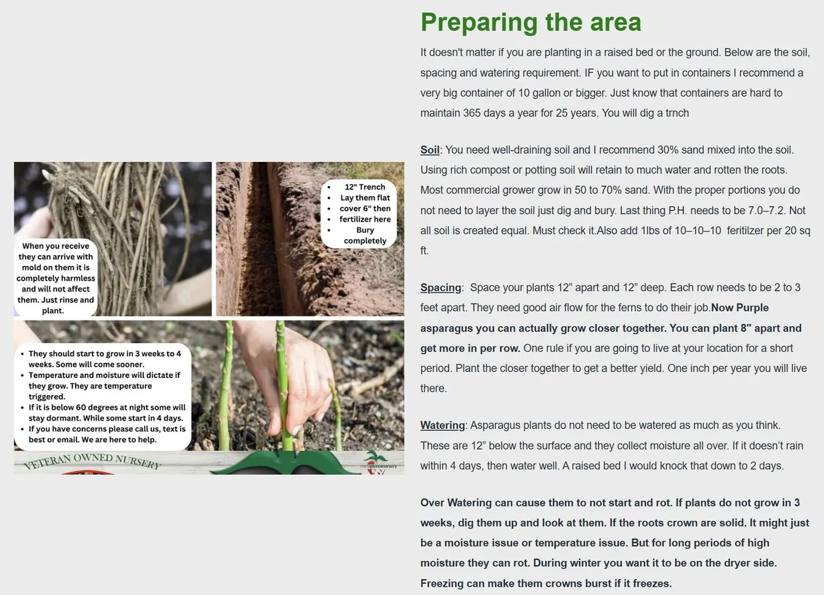 - Q: What soil pH level is best for growing asparagus? A: Asparagus prefers a slightly acidic to neutral soil pH, ideally between 6.5 and 7.5. It’s important to test your soil and amend it with lime to raise pH or sulfur to lower it, if necessary, for optimal growth of your Grande F1 Asparagus Crowns.