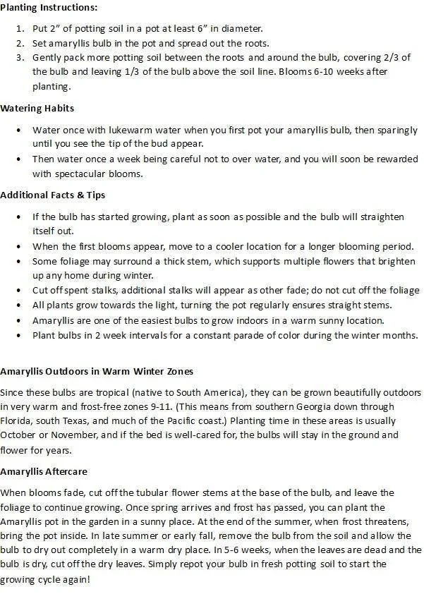 • Q: How long until it blooms? A: Typically, the exotic amaryllis bulb will bloom approximately 6-8 weeks after planting, given the right growing conditions. The exact timing can vary slightly based on temperature and light.
