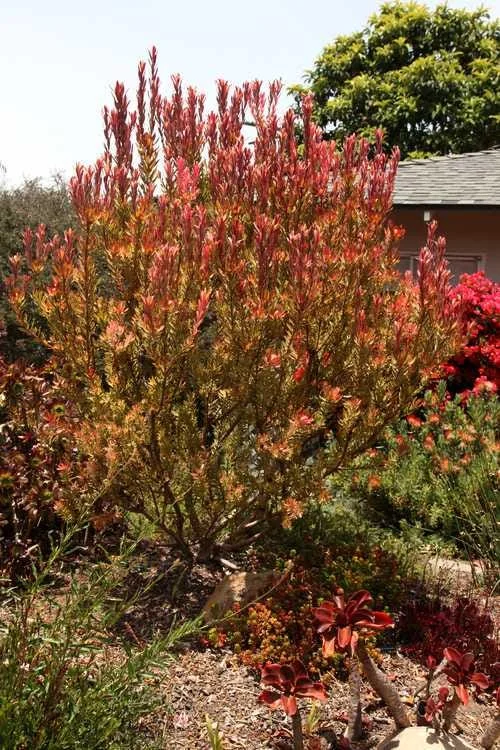 • Stunning Seasonal Color: Enjoy a prolonged display of vibrant dark red bracts from fall through spring, providing much-needed color during colder months when other plants are dormant. The unique appearance of the Jester Leucadendron shrub ensures your garden remains lively and engaging.