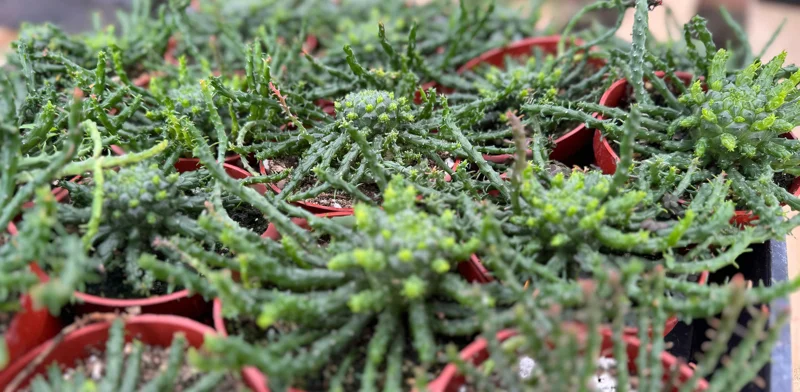 The stems of Euphorbia flanaganii are thick, fleshy, and cylindrical, and they can grow up to 12 inches (30 cm) tall. The plant's stems are covered in small, triangular leaves that are arranged in a spiral pattern, giving the plant its unique look. In addition to its distinctive stems, Euphorbia flanaganii produces small, inconspicuous flowers that are typically greenish-yellow in color.