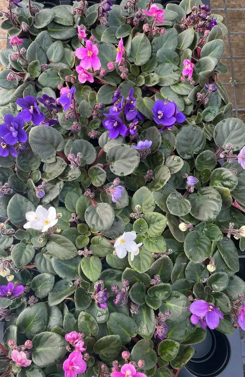 Q: What condition will it arrive in? A: Your plants will arrive as live, rooted specimens in their 2-inch nursery pots. While we ensure careful packaging, the variety and color of the violet will vary, and they may not be in bloom upon arrival.