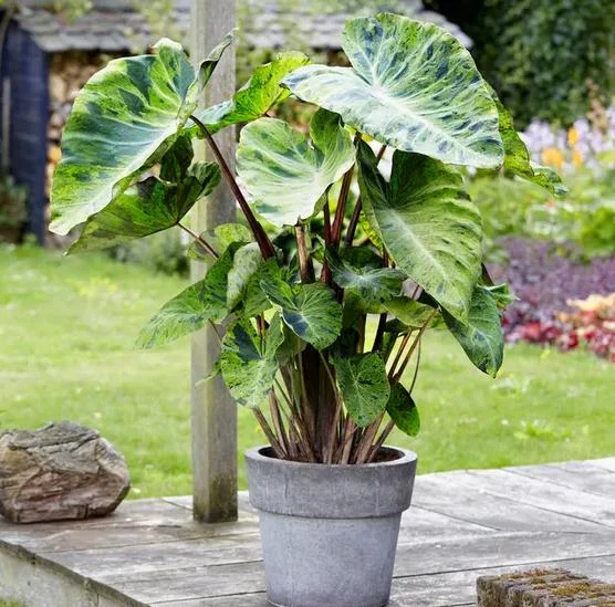 The plant will establish roots quickly once potted. Expect new leaves to unfurl regularly during its active growing season. While specific pot size is not included, we recommend starting with at least a 6-inch diameter pot for initial planting, quickly moving to a 10-12 inch or larger container as the plant grows to accommodate its robust root system and large foliage. This ensures your elephant ear taro plant has ample room to thrive and develop its striking variegated elephant ear leaves.