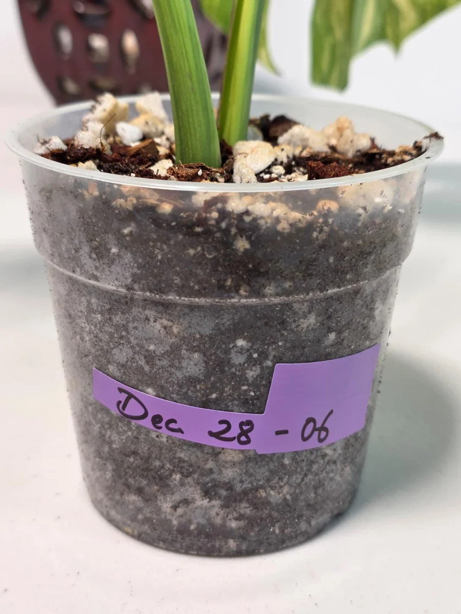 Watering: Allow the top inch or two of the soil to dry out completely before watering thoroughly. When you water, ensure that excess water can drain away freely to prevent root rot. Variegated Monsteras generally prefer slightly drier conditions compared to consistently moist soil. Overwatering is a common mistake and can be detrimental. Soil: Use a well-draining potting mix specifically designed for aroids or tropical plants. A mix containing perlite, orchid bark, and coco coir will provide the necessary aeration and drainage. Good drainage is crucial to prevent waterlogged roots.
