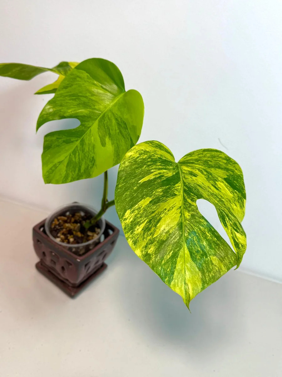 The Monstera Aurea Variegated Borsigiana is more than just a plant; it’s a statement piece. Its dramatic foliage and impressive size, as it matures, command attention and become a focal point in any room. Originating from tropical climates, this plant thrives indoors with proper attention to its specific needs, bringing a lush, jungle-like feel to your living space. Its rarity contributes to its desirability, making it a special addition to any collection. Whether you are a seasoned plant parent or looking to expand your horizons with a truly unique specimen, the Monstera Aurea Variegiana Borsigiana offers unparalleled beauty and a rewarding growing experience.