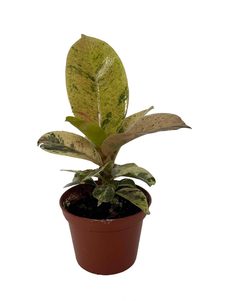 Bring home the exquisite Moonshine Rubber Tree live plant, a truly rare Ficus Elastica Shivereana care for its unique variegated foliage. This 2.5″ potted beauty boasts lime green, mint, cream, and white leaves, perfect for adding a touch of elegance to your indoor collection. A stunning variegated rubber tree that thrives with bright indirect light.