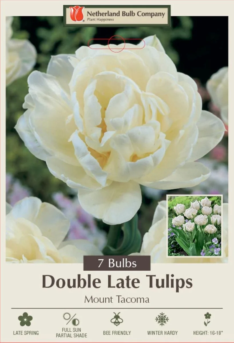 - Q: Is this an indoor or outdoor plant? A: The Mount Tacoma Double Late Tulip is an outdoor plant. It is specifically bred for garden beds, borders, and outdoor containers and is not suitable for indoor culture or forcing.