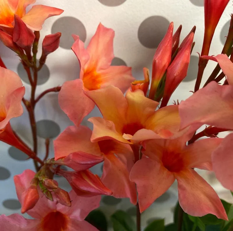 Watering: Water consistently, especially during warm, dry periods. The soil should be kept moist but never waterlogged, as Mandevillas are sensitive to overwatering and can develop root rot. Allow the top inch of soil to dry out slightly between waterings. Reduce watering frequency in cooler months. Thanks to their tuberous roots, they can tolerate short periods of drought, but regular watering promotes the best bloom production.