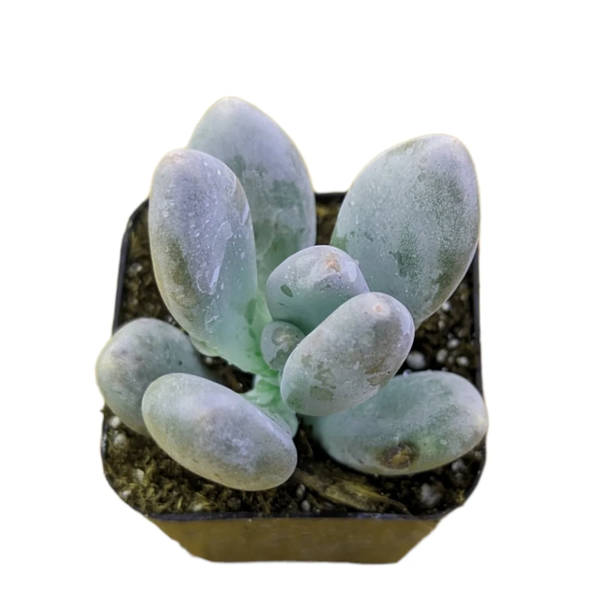 The Pachyphytum oviferum Pink Moonstone is typically offered in various sizes to suit different preferences and planting needs. Smaller plants, often around 2 inches in diameter, are usually shipped with their pot and soil, making them ready for immediate display or transplanting. Larger specimens, such as those 4 inches and above, are commonly shipped bare-root to ensure their health during transit and to minimize shipping stress. These plants are known for their moderate growth rate, eventually forming small, compact clusters. Expect your Pink Moonstone succulent plant to reach a mature size of about 4-6 inches in height and width, making it an ideal choice for windowsills, terrariums, or small garden spaces. The exact shape and color may vary slightly from the product images, as each live plant is unique and adapts to its environment.