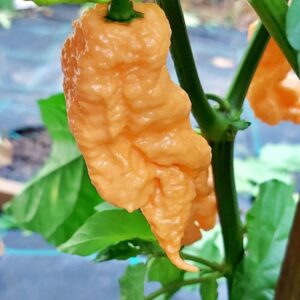Peach Bhut Jolokia Ghost Chili Pepper plants are the ultimate choice for spice lovers. This set of 8 live seedlings, each 3-6 inches tall, is perfect for immediate transplanting into your garden or pots. Known for their extreme heat and unique peach color, these peppers are a must-have for any avid gardener.