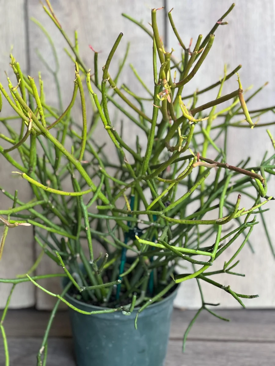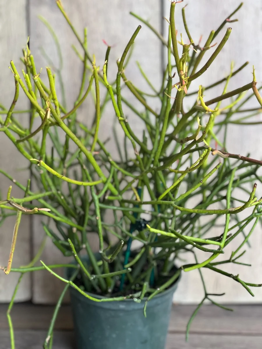 Q: What is the milky sap that comes from the plant? A: The milky white sap is latex, which is characteristic of Euphorbia plants. It can be a skin and eye irritant, so it’s advisable to wear gloves when handling the plant, especially during pruning.