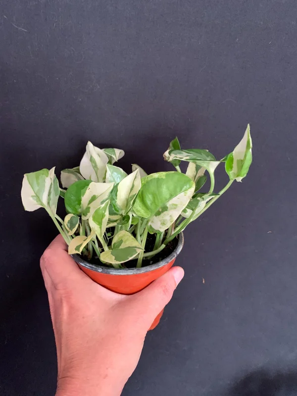 Bring home a stunning pothos n’joy live plant in a 4 inch pot, featuring beautiful creamy white and green variegated foliage. This easy care indoor plant is perfect for hanging baskets or shelves, adding a touch of elegance to any space.