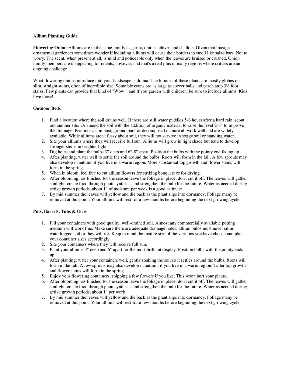 - Q: What condition will the bulbs arrive in? A: Your allium flower bulbs will arrive in a dormant state, which is perfectly normal and healthy for fall planting. They will be firm and ready to be planted directly into your garden.