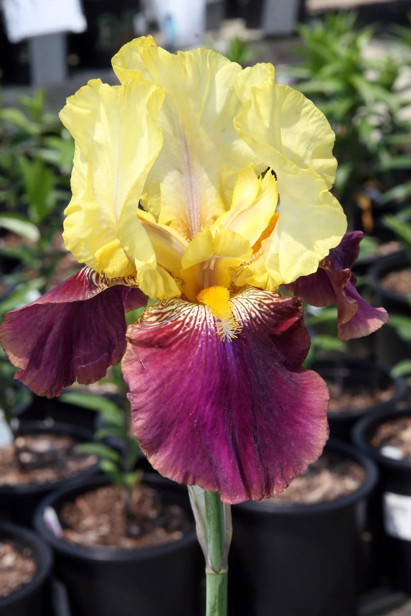 - Striking Color Combination: The elegant contrast of lemon-yellow standards and rich burgundy falls creates a dramatic and sophisticated look, making this reblooming bearded iris bare root a focal point in any landscape.