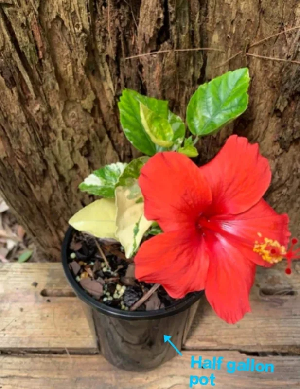 - Q: What size pot does it come in? A: This hibiscus plant is shipped in a 1/2 gallon hibiscus nursery pot, providing it with a good start and healthy root system for transplanting.