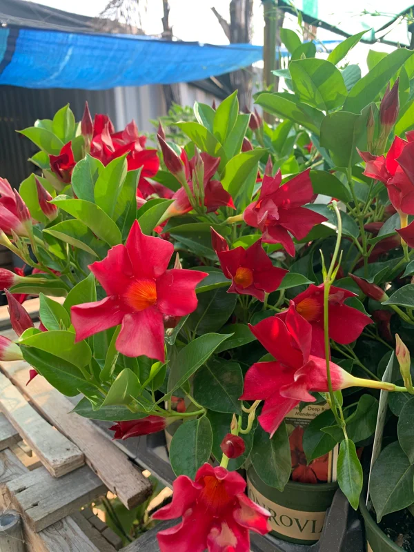 - Lush, Glossy Foliage: Beyond its flowers, the red mandevilla live plant boasts attractive, dark green, glossy leaves that provide a beautiful backdrop, even when not in full bloom, adding texture and depth to your landscape.