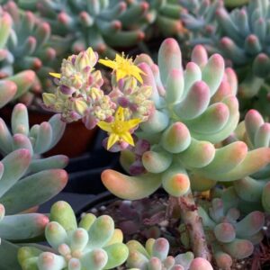 The Sedum Green Jelly Beans Plant, also known as Sedum Pachyphyllum, is a delightful addition to any indoor garden. This small succulent shrub is recognized for its unique blue jellybean-like leaves that turn to enchanting pink-red tips in winter. This plant not only adds beauty but also enhances the aesthetics of your living space.