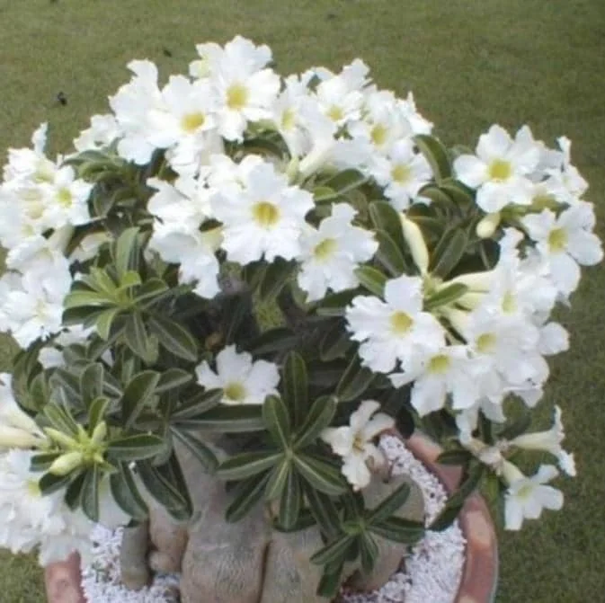 The white desert rose live plant prefers warm temperatures, ideally above 65°F (18°C). It is hardy in USDA zones 10–11 and must be protected from frost, which can severely damage or kill the plant. If you live in a cooler climate, grow it in a container so it can be moved indoors during colder months. Fertilize sparingly during the growing season (spring and summer) with a balanced liquid fertilizer diluted to half strength. Repotting should be done in spring or early summer, choosing a pot with good drainage and enough room for the caudex to expand. Pruning can be done to maintain shape, encourage branching, and promote more blooms, especially if you are cultivating a white desert rose bonsai specimen.