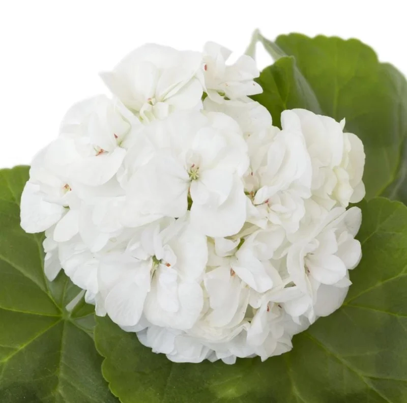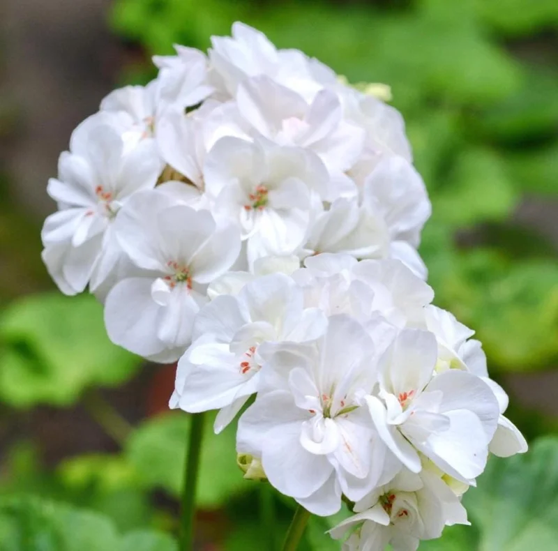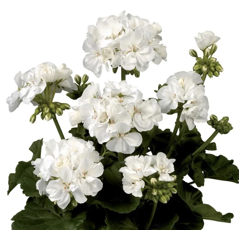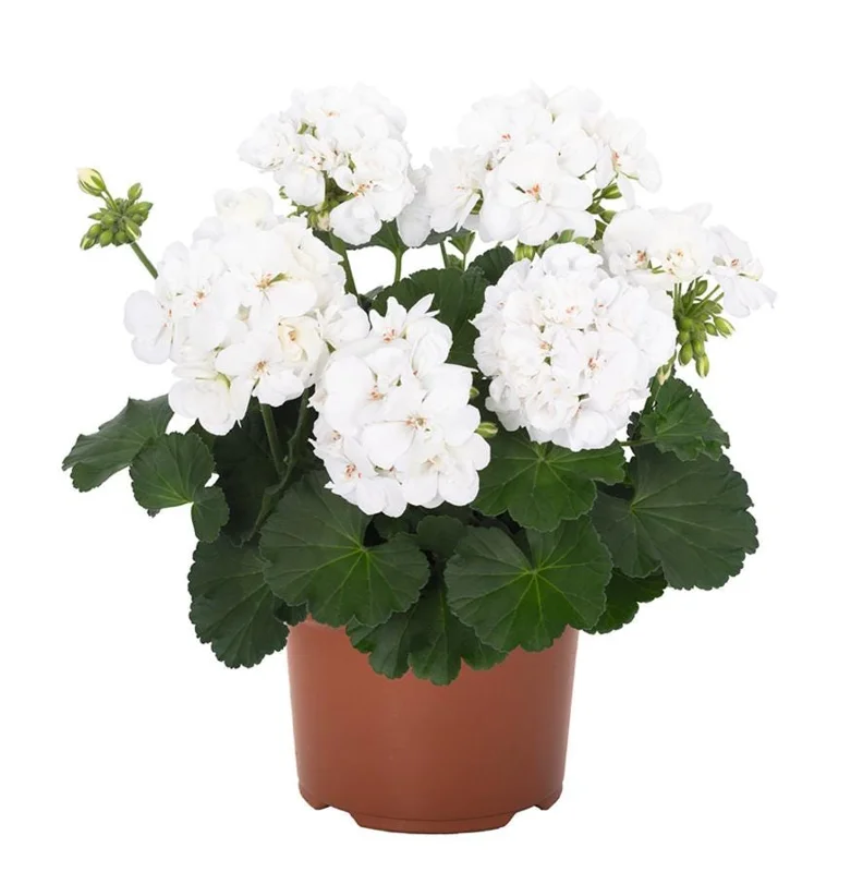 Geraniums are generally robust but benefit from occasional feeding with a balanced liquid fertilizer during their active growing season (spring and summer) to support their continuous flowering. Protect them from frost if you live in zones colder than 10, as they are not frost-tolerant. In colder regions, they can be treated as annuals or overwintered indoors. Proper spacing, about 12 to 24 inches apart, allows for good air circulation and provides room for them to fill out, creating a beautiful display of white flowering plants.