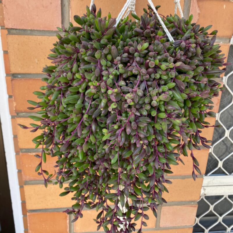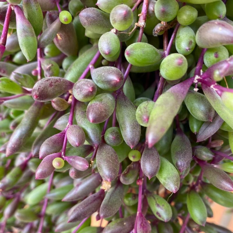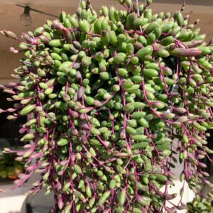 String Of Rubies Succulents, also known as Othonna Capensis or Ruby Necklace, are unique plants that add a splash of color to any environment. Their trailing habit makes them perfect for hanging baskets or as charming ground cover. When exposed to bright sunlight, these succulents can transform from a rich green to stunning shades of purple and reddish-brown, enhancing their visual appeal.