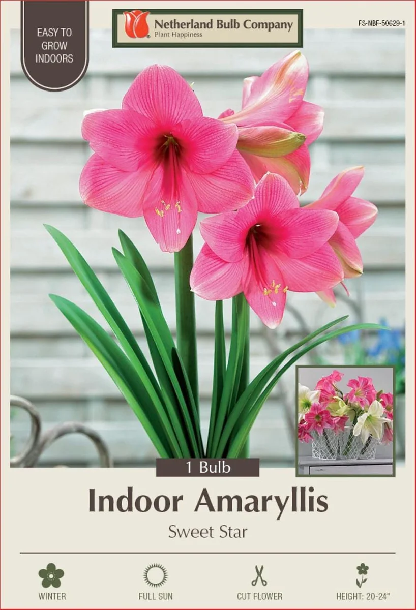 Q: How big does this Amaryllis flower get? A: The Sweet Star Amaryllis bulb is a giant 32/34 cm size, meaning it can produce very large flowers, typically 6-8 inches across. The flower stalks themselves can reach 18-24 inches tall, creating a dramatic display.