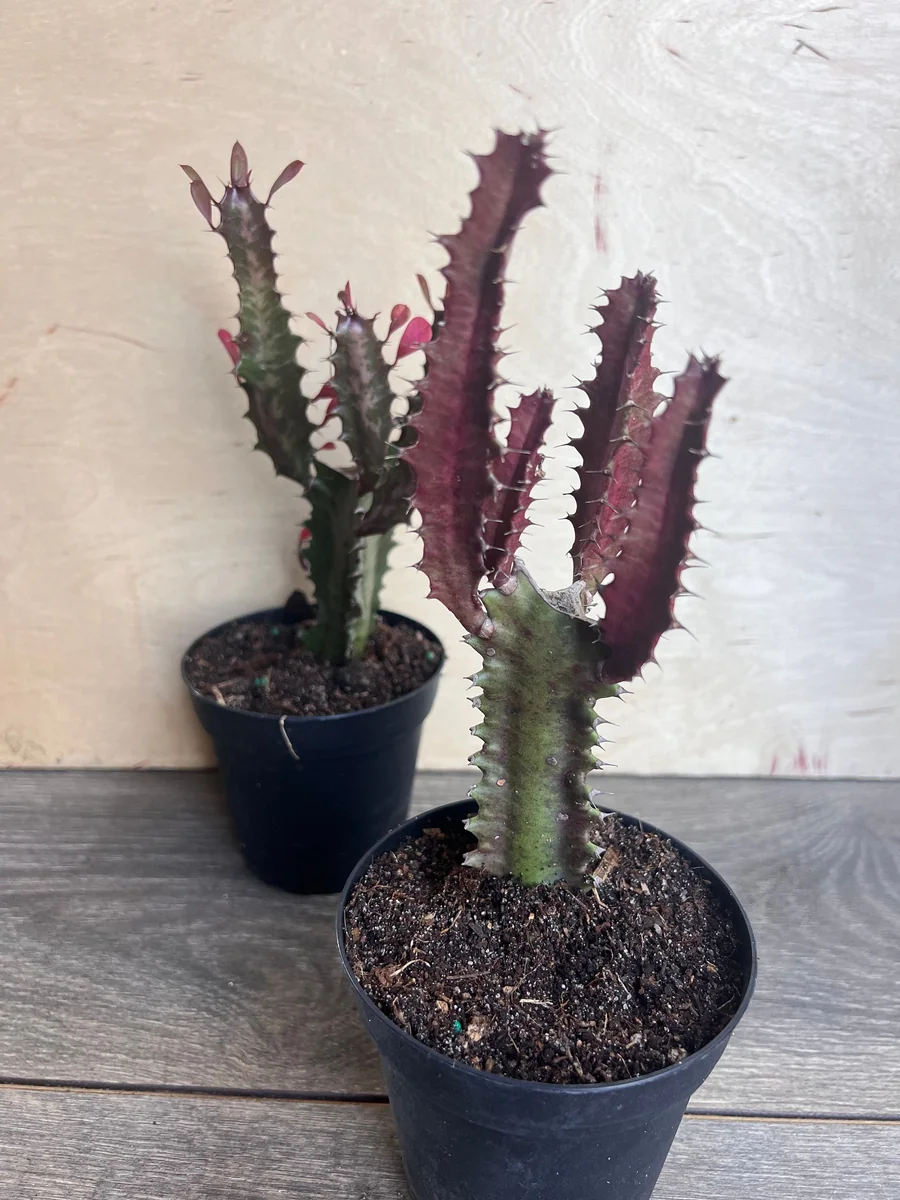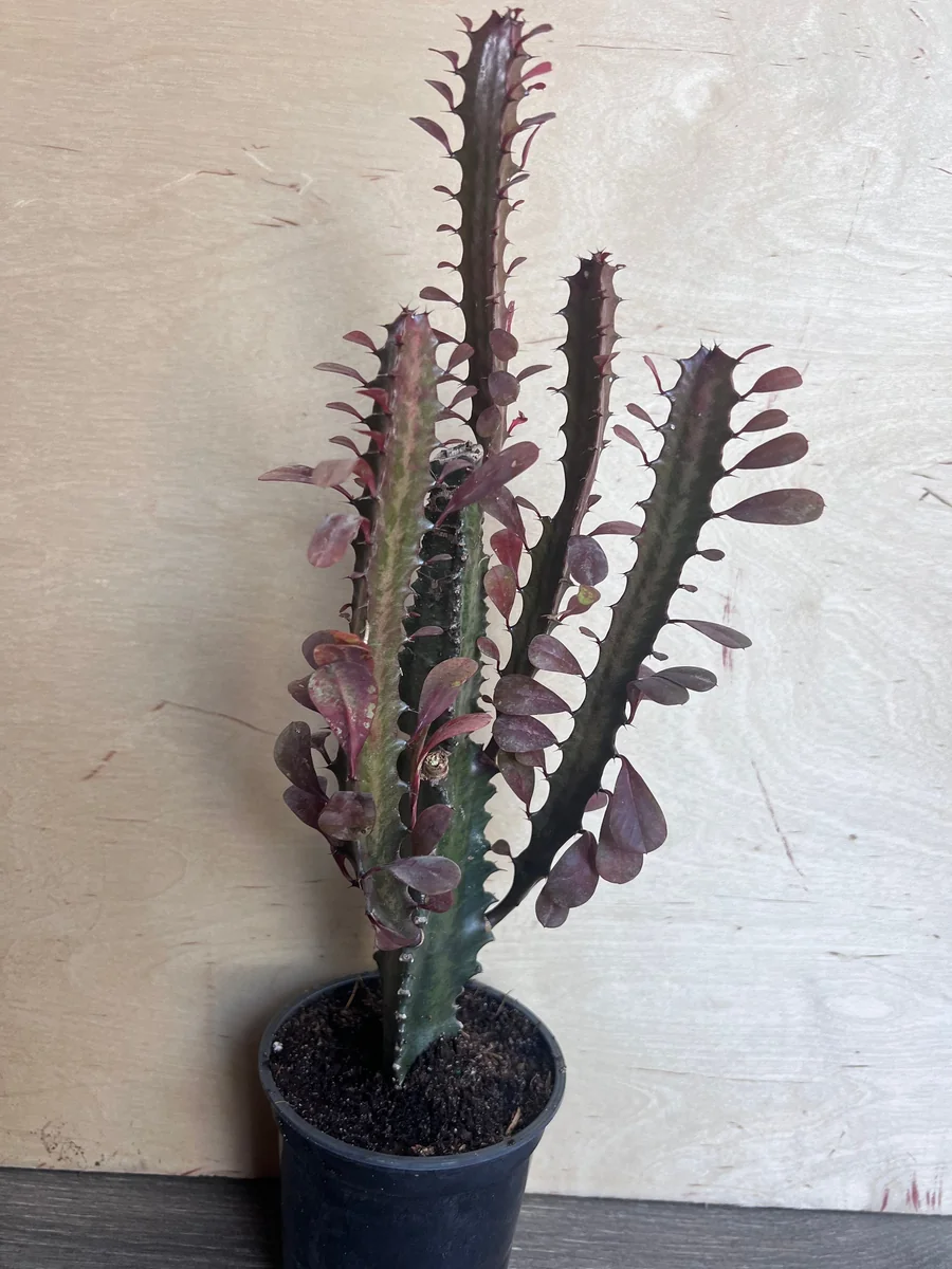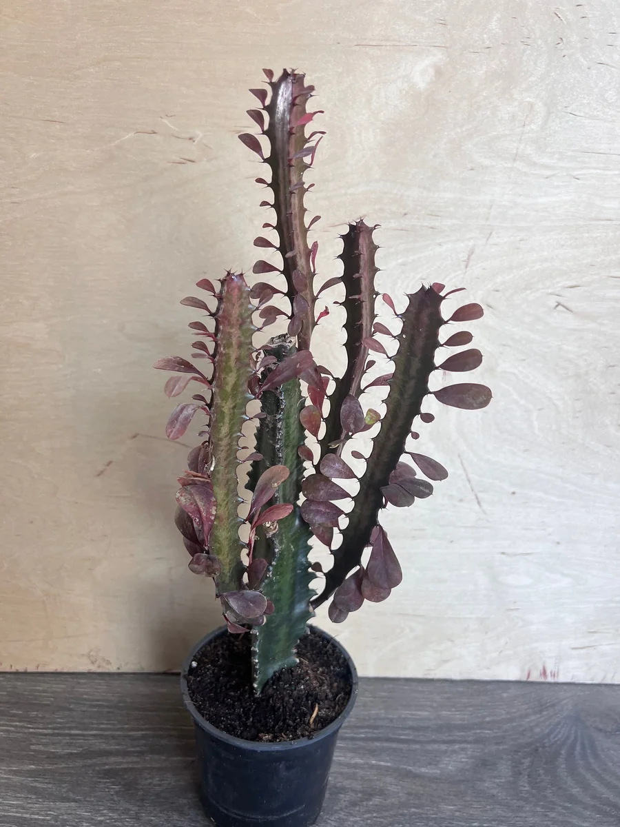 The Trigona Purple live plant typically ships in a 4-inch nursery pot, providing a well-established specimen ready for your home. At this stage, the plant usually stands between 6-10 inches tall, including the pot. This size makes it perfect for placement on desks, shelves, or as part of a larger succulent arrangement. When mature, the architectural plants indoor like this African Milk Tree can grow quite tall, reaching heights of 6 feet or more indoors under optimal conditions, though growth is generally slow, especially in a pot. Its columnar growth habit means it remains relatively narrow, making it suitable for smaller spaces where a vertical accent is desired. The plant will continue to grow upwards, developing more branches over time, enhancing its striking silhouette. It’s a long-term investment in unique botanical beauty.