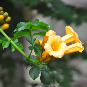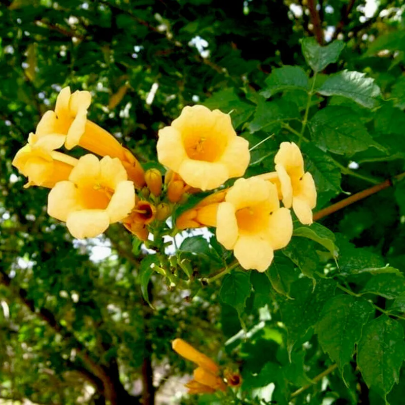 The Trumpet Plant is a stunning addition to any garden, known for its vibrant flowers in Flamenco Red, Orange, and Yellow. This live climbing vine is an excellent choice for those looking to attract wildlife, including hummingbirds, butterflies, and bees. It adapts well to different light conditions, thriving in both full sun and partial shade.