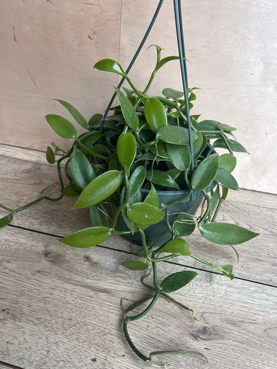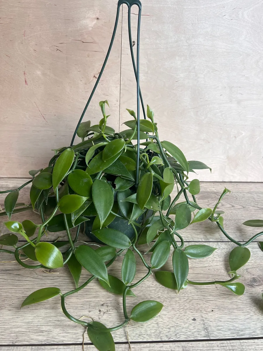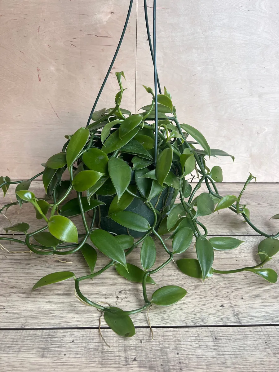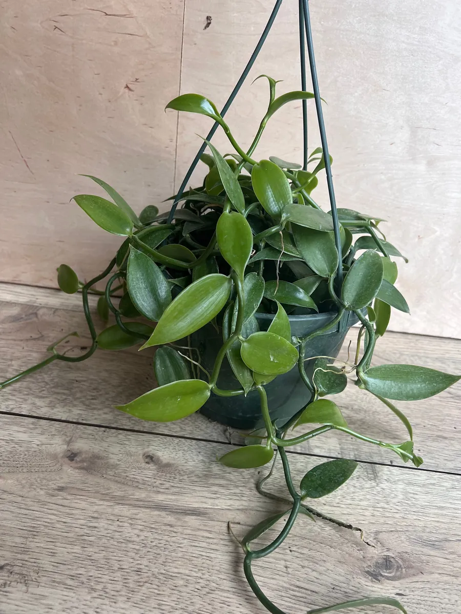 This offering is for one Vanilla Planifolia live plant, delivered in an 8-inch hanging basket (HB). The plant is a mature vine, showcasing its characteristic bright green, oval leaves. The exact length of the vine may vary but will be well-established and ready for continued growth. The 8-inch pot provides ample space for the root system to develop and for the vine to begin its upward or trailing journey. The leaves typically range from 3 to 24 inches in length, contributing to its lush appearance. This vanilla bean vine is a perennial and, with optimal conditions, can reach impressive lengths over time, potentially exceeding 200 feet in its natural environment. When you receive your plant, it will be a robust specimen, carefully packaged to ensure a safe journey. Expect a healthy, actively growing plant that is eager to adapt to its new home.