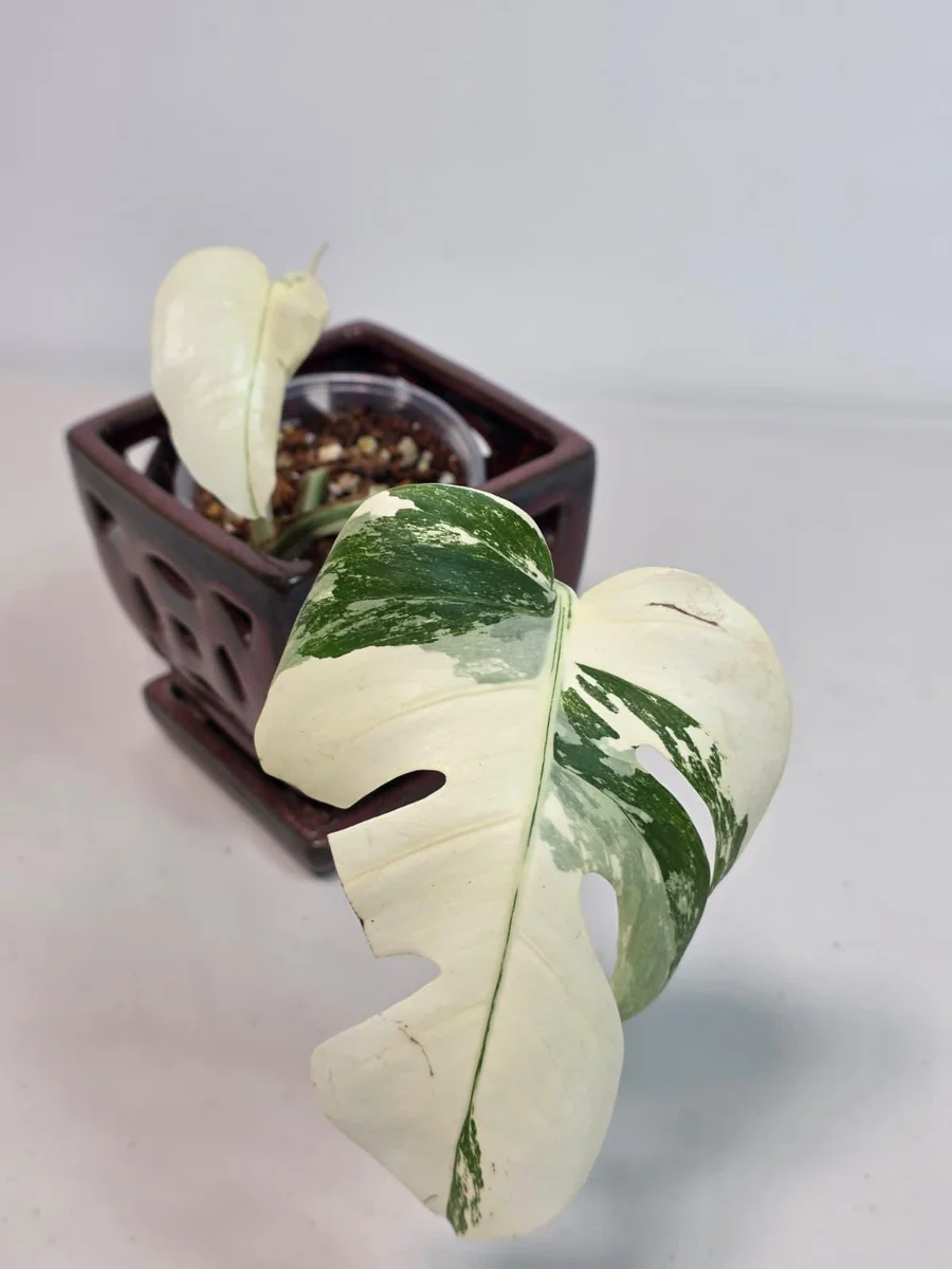 Elevate your indoor garden with the exceptional variegated monstera albo live plant, a true collector’s item among houseplant enthusiasts. This highly coveted aroid, scientifically known as Monstera deliciosa ‘Albo Borsigiana’, is celebrated for its breathtaking white and green marbled foliage. Each leaf is a unique piece of living art, showcasing intricate patterns of bright white variegation against deep green. Unlike common houseplants, the white monstera albo offers a sophisticated aesthetic, making it a focal point in any room. This particular specimen is a top cut potted plant, ensuring a well-established and vigorous start for your collection. Its striking appearance and relatively manageable care requirements make it an ideal choice for both seasoned plant parents and those looking to add a truly special plant to their home.