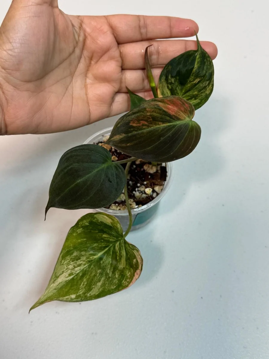 This variegated philodendron mican aurea is delivered as a live plant, carefully cultivated and established in a nursery pot. While exact dimensions can vary slightly with each unique specimen, you can expect a healthy, actively growing plant that is typically 4-6 inches in height above the soil line with several established leaves, ready to continue its growth journey. The plant is shipped in its nursery pot, providing a stable environment for transit and allowing for a smooth transition to your home. Its vining nature means it will quickly begin to produce long stems that can elegantly trail or be trained to climb. The growth rate is considered fast under ideal conditions, allowing you to enjoy a rapidly developing and expanding plant. This indoor variegated plant is a juvenile specimen, offering the exciting prospect of watching it mature and develop its full array of striking leaf colors.